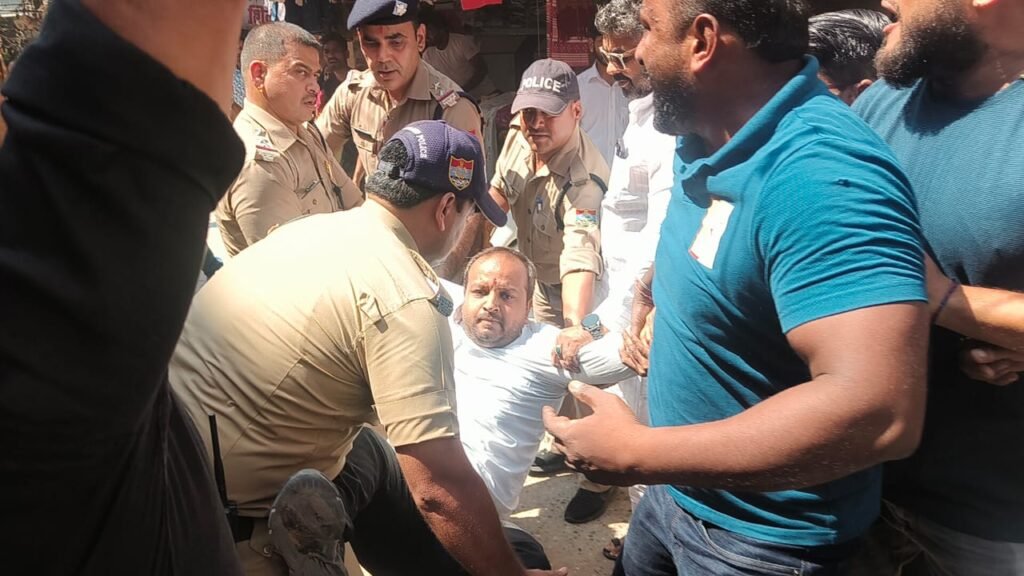 हरिद्वार। प्रदेश के मुख्यमंत्री पुष्कर सिंह धामी द्वारा आज हर की पैड़ी के आसपास के बाजारों में जीएसटी बचत उत्सव कार्यक्रम के तहत दुकानदारों को जीएसटी कम होने के फायदे बताने आए थे कि उसी दौरान मुख्यमंत्री पुष्कर सिंह धामी का विरोध करने के लिए महानगर कांग्रेस अध्यक्ष अमन गर्ग के नेतृत्व में कांग्रेसियों ने मुख्यमंत्री धामी गौ बैक, कारिडोर पर जवाब दो, जीएसटी की लूट का हिसाब दो, के नारे लगाते हुए हरिद्वार मंडी चौक से हर की पैड़ी की तरफ कूच करने लगे, जिसके चलते पुलिस प्रशासन के हाथ पांव फूल गए और उन्होंने एक एक कर सभी कांग्रेसियों को गिरफ्तार कर लिया और गिरफ्तार करने के बाद पुलिस लाइन ले गए।