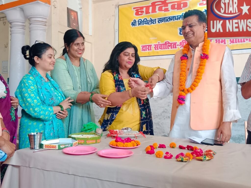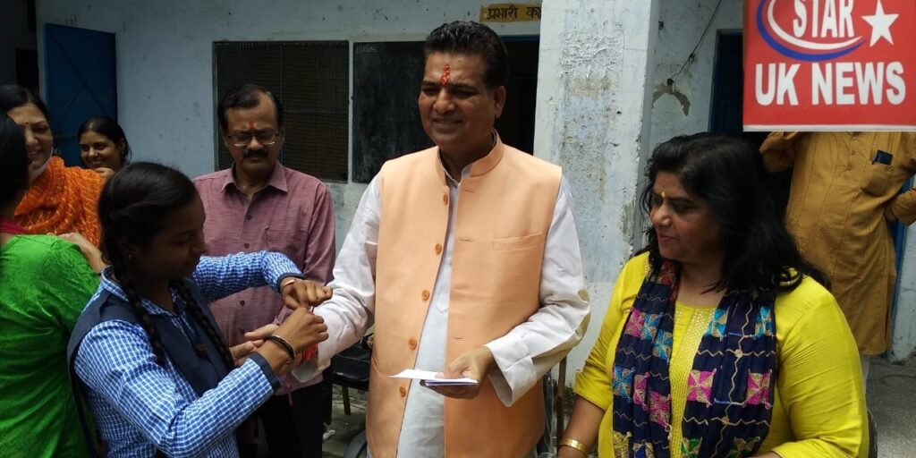 श्री मिथिलेश सनातन धर्म इंटर कॉलेज कनखल और उसकी खड़खड़ी शाखा में आज रक्षाबंधन की पूर्व संध्या पर रक्षा बंधन पर्व और हर घर तिरंगा अभियान एक साथ मनाया गया छात्र छात्राओं और शिक्षिकाओं ने मुख्य अतिथि लक्सर विधानसभा क्षेत्र के पूर्व विधायक वरिष्ठ भाजपा नेता संजय गुप्ता और उनके साथियों को रक्षा सूत्र बांधा और उनके दीर्घायु स्वस्थ जीवन और मंगल जीवन की कामना की