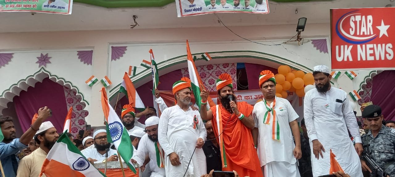 आजादी का 75 वां अमृत महोत्सव पूरे देश में बड़ी धूमधाम से मनाया जा रहा है धर्म नगरी हरिद्वार में भी अमृत महोत्सव को लेकर काफी उत्साह देखने को मिल रहा है योग गुरु बाबा रामदेव ने मदरसा इस्लामिया अरबिया कुरान बोड़ा हेडी मैं झंडा फहराकर हिंदू मुस्लिम भाईचारे का संदेश दिया पतंजलि योगपीठ से मदरसे तक योग गुरु बाबा रामदेव आचार्य बालकृष्ण सहित पतंजलि योगपीठ के कार्यकर्ता द्वारा तिरंगा यात्रा निकाली गई मदरसे में ध्वजारोहण कार्यक्रम में हजारों की तादाद में मुस्लिम समुदाय और मदरसे में पढ़ने वाले बच्चे भी शामिल हुए