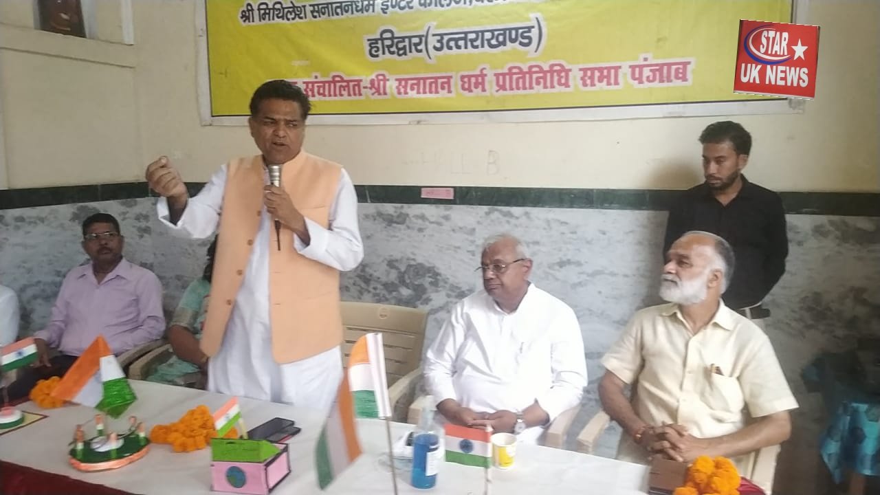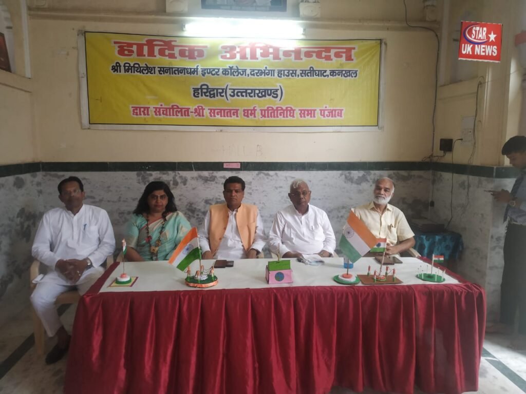आज आजादी की 75 वीं वर्षगांठ के अवसर पर श्री मिथिलेश मिथिलेश सनातन धर्म इंटर कॉलेज कनखल और खड़खड़ी शाखा में आजादी का अमृत महोत्सव कार्यक्रम उल्लास पूर्वक मनाया गया इस अवसर पर श्री मिथिलेश सनातन धर्म इंटर कॉलेज कनखल के परिसर में ध्वजारोहण किया गया मुख्य अतिथि के रुप में बोलते हुए पूर्व विधायक वरिष्ठ भाजपा नेता संजय गुप्ता ने कहा कि श्री सनातन धर्म प्रतिनिधि सभा के संस्थापक जाग मूर्ति गोस्वामी गणेश दत्त महाराज का आजादी के आंदोलन में विशेष योगदान रहा आजादी के बाद उन्होंने पाकिस्तान से हिंदुस्तान आए सभी भाइयों के विस्थापन में महत्वपूर्ण भूमिका निभाई और साथ ही आजादी के बाद उत्तर भारत में शिक्षा की अलख जगाई उन्होंने कहा कि सनातन धर्म प्रतिनिधि सभा के देश के विकास में दिए गए योगदान को कभी भुलाया नहीं जा सकता है
