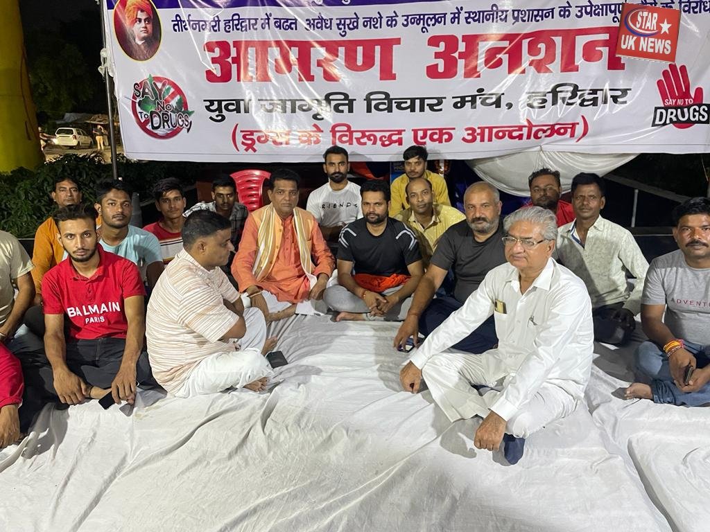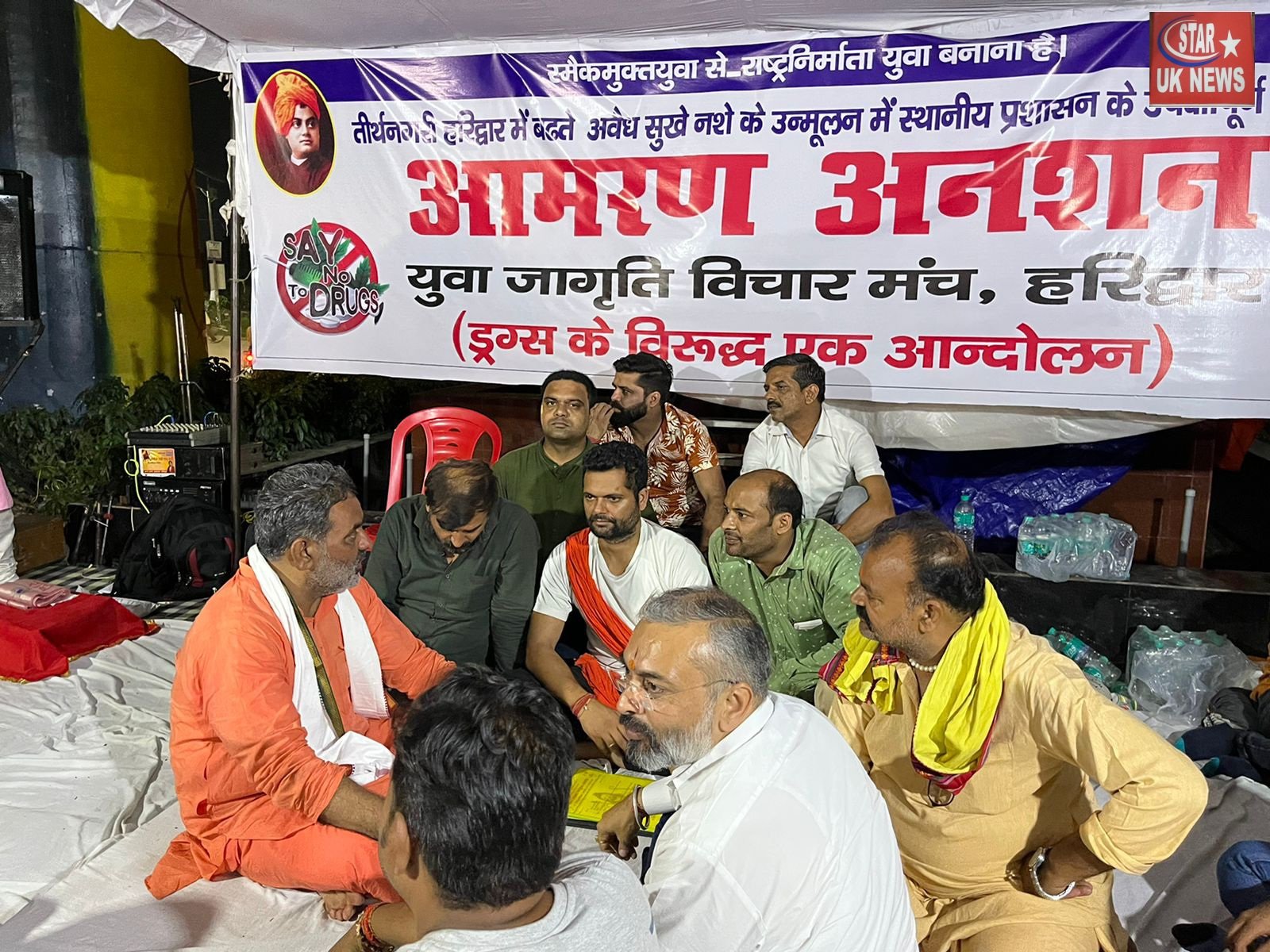 हरिद्वार में बढ़ रहे ड्रग्स के कारोबार को लेकर जो सराहनीय कदम युवा जागृति विचार मंच के युवा साथियों द्वारा आमरण अनशन पर बैठकर जो कदम पिछले 5 दिनों से मनीष चौहान द्वारा सिंहद्वार स्थल पर उठाया गया है यह सभी साथियों के लिए प्रेरणादायक है किंतु एक बात देखकर हम सभी युवा जागृति विचार मंच के साथियों को आश्चर्य होता है कि आज तक स्थानीय विधायक का आमरण अनशन स्थल पर ना पहुंचना यह दर्शाता है कि स्थानीय विधायक जी को युवाओं के भविष्य की कोई चिंता नहीं है शाम के के समय लक्सर के पूर्व विधायक और भाजपा नेता संजय गुप्ता अपने कई साथियों के साथ अनशन स्थल पर पहुंचे और वहां पहुंच कर अनशन करे लोगों से बातचीत की संजय गुप्ता का कहना है कि मुख्यमंत्री पुष्कर सिंह धामी का सीधा-सीधा आदेश है कि उत्तराखंड राज्य नशा मुक्त होगा आपके बारे में जो अत्यंत चल रहा है इस मामले में मैं मुख्यमंत्री से बात कर रहा हूं शीघ्र ही आप की मांगों पर प्रशासन द्वारा कार्रवाई कराई जाएगी वही नगर पालिका के पूर्व अध्यक्ष कमल जोरा ने भी अनशन पर बैठे को हर तरह से सहयोग देने की बात कही और अनशन करता का समर्थथन किया पूर्व विधायक स्वामी यतिस्वरानंद ने भी समर्थन किया और इस मामले में मैंैं मुख्यमंत्री से सीधी बात कर रहा हूं और हर संभव मदद कियाा की जाएगी ताकि हरिद्वार को नशााा मुक्त किया जा स इस कार्य के लिए हम प्रतिबंध है
